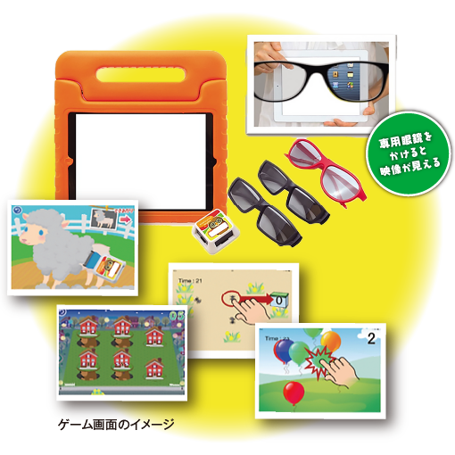 弱視訓練用に特殊加工された画面は、裸眼で見ると真っ白にしか見えませんが、専用眼鏡をかけると本来の映像が見える仕組みです。